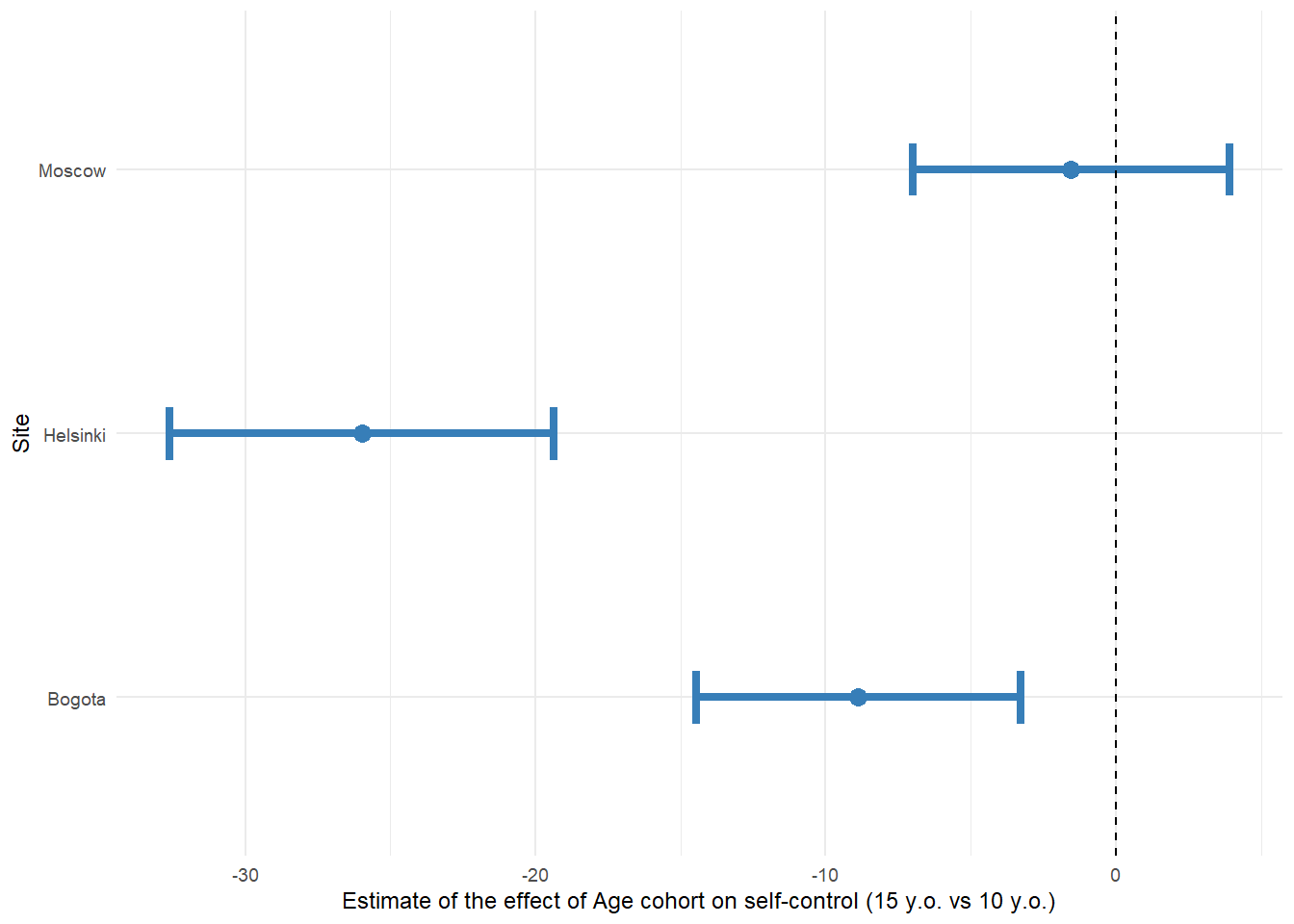 Below is a plot showing the estimates and 95% confidence intervals for the effect of age cohort on self-control by site.