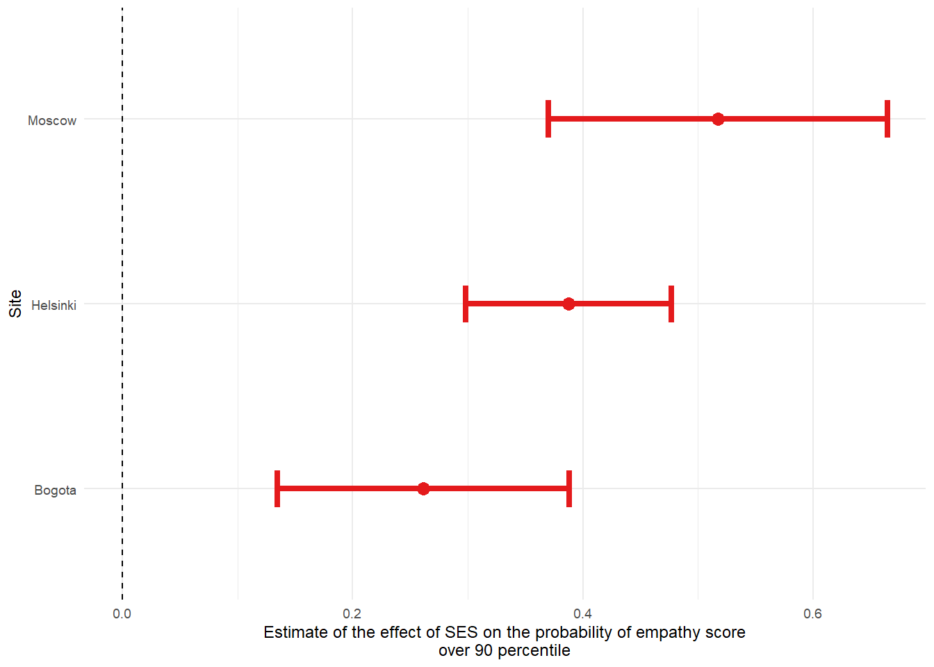 x = "Estimate of the effect of SES on the probability of empathy score\nover 90 percentile",