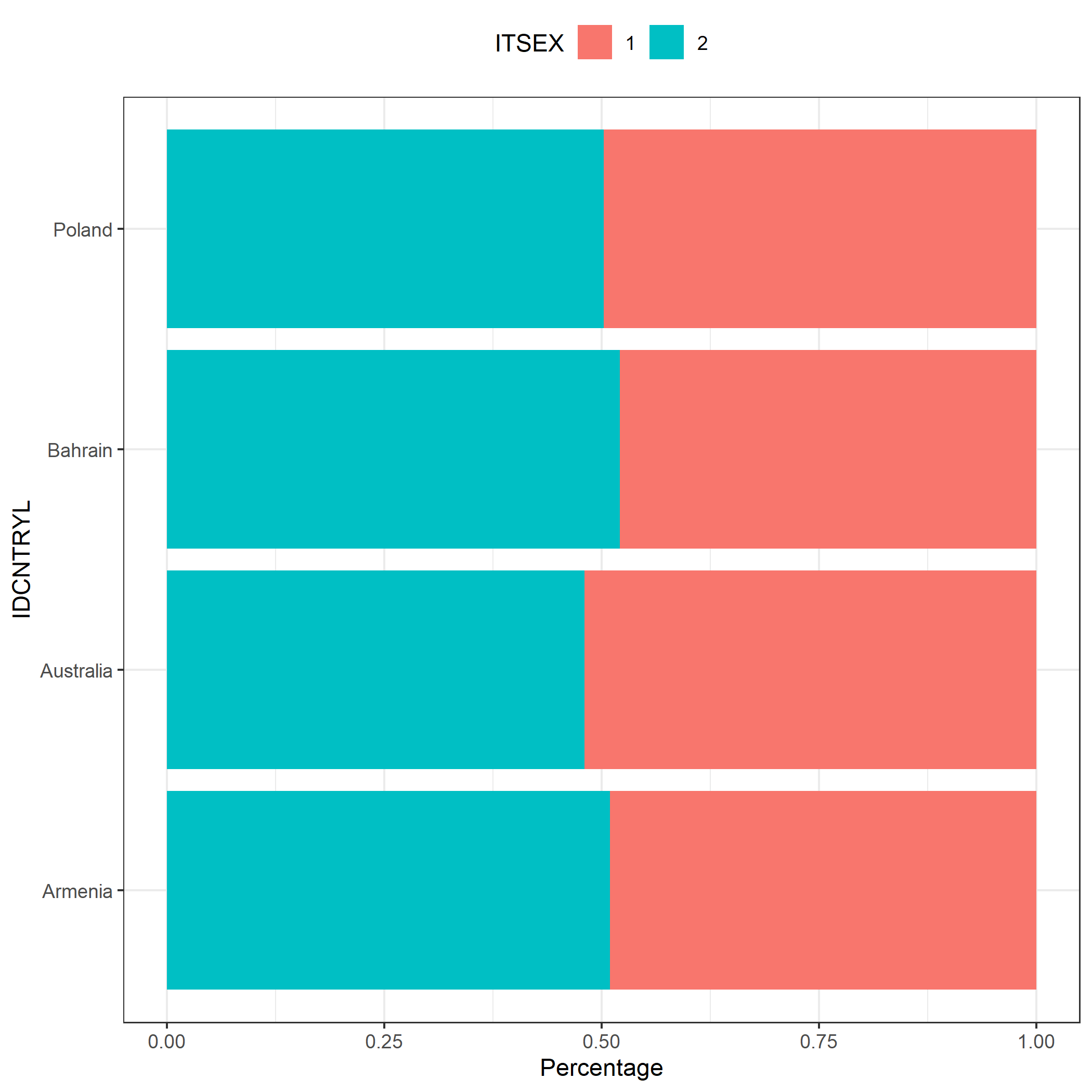 timss.table(variable = "ITSEX", by = "IDCNTRYL", data = timss23)