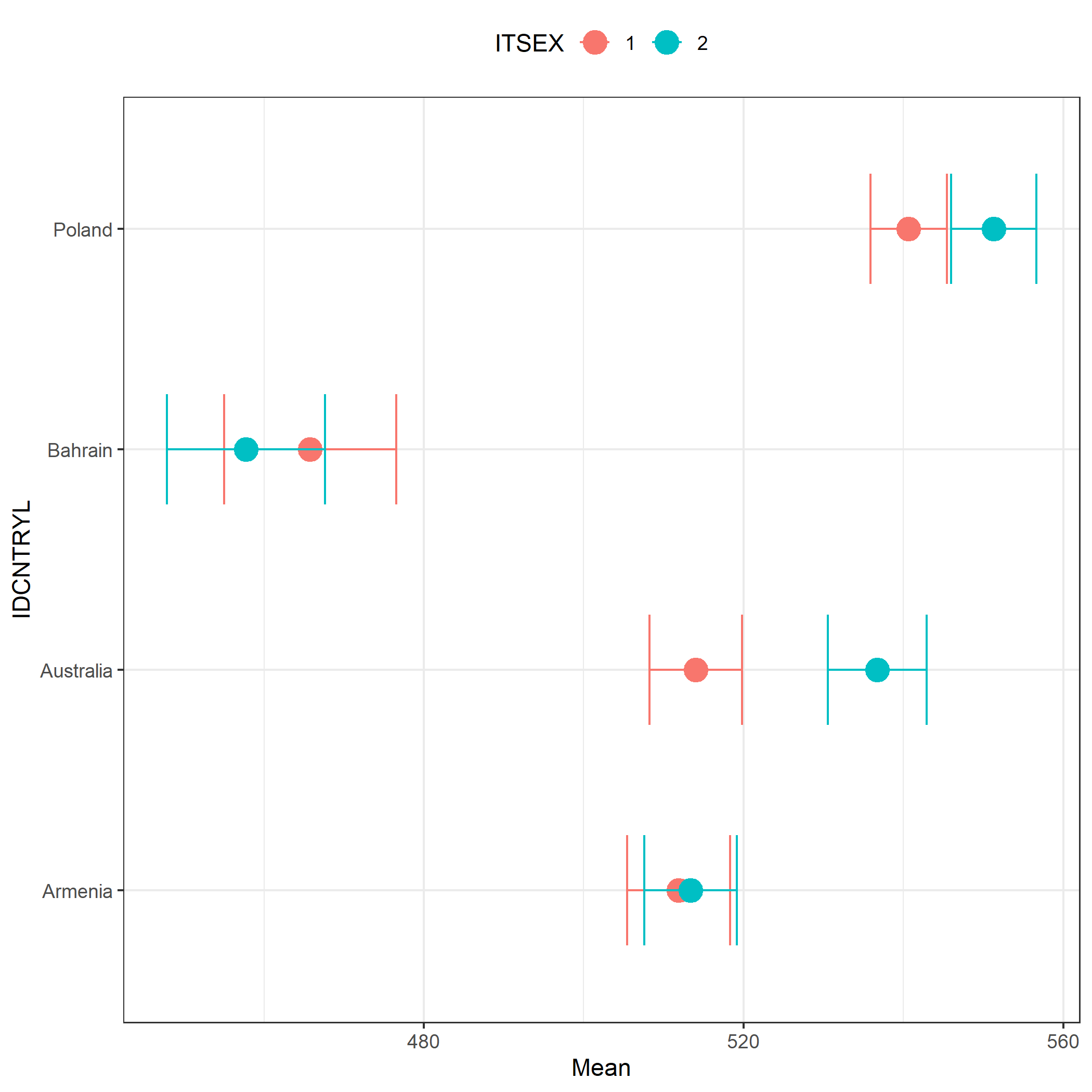 Wyniki analiz przeprowadzonych za pomocą funkcji pakietu intsvy (średnich, regresji, rozkładów częstości) można wizualizować za pomocą dedykowanych funkcji plot().