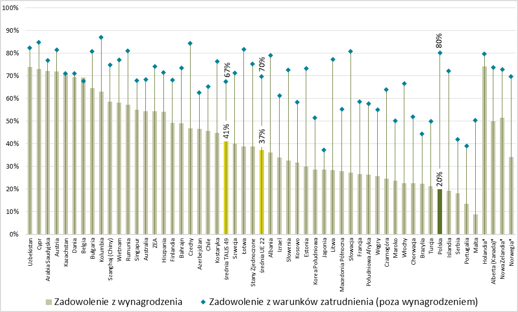 Wykres 1. Zadowolenie z warunków zatrudnienia i wynagrodzenia – porównanie międzynarodowe