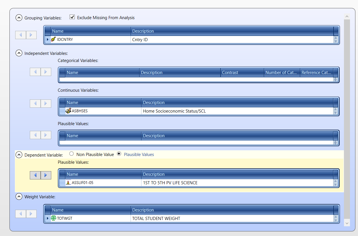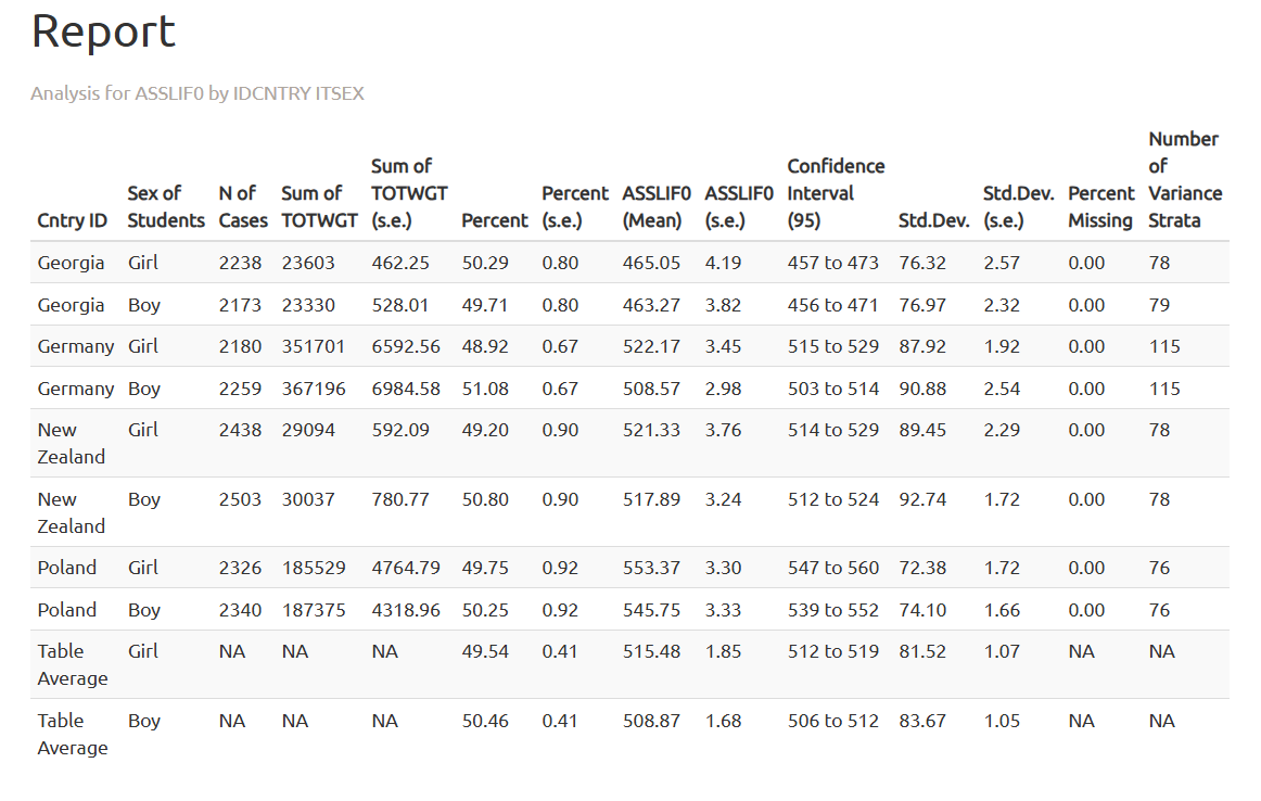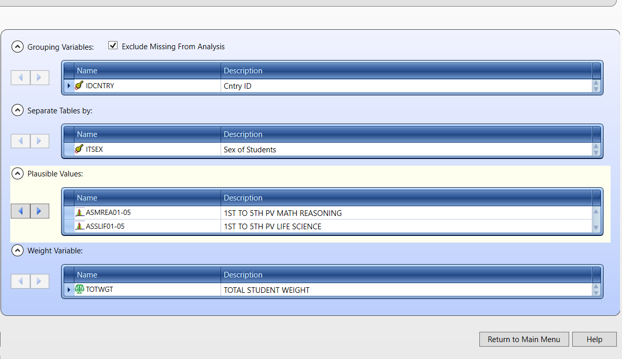 We want to separate tables by gender and use the plausible values of mathematical reasoning and life science scores. The weights are selected by default.