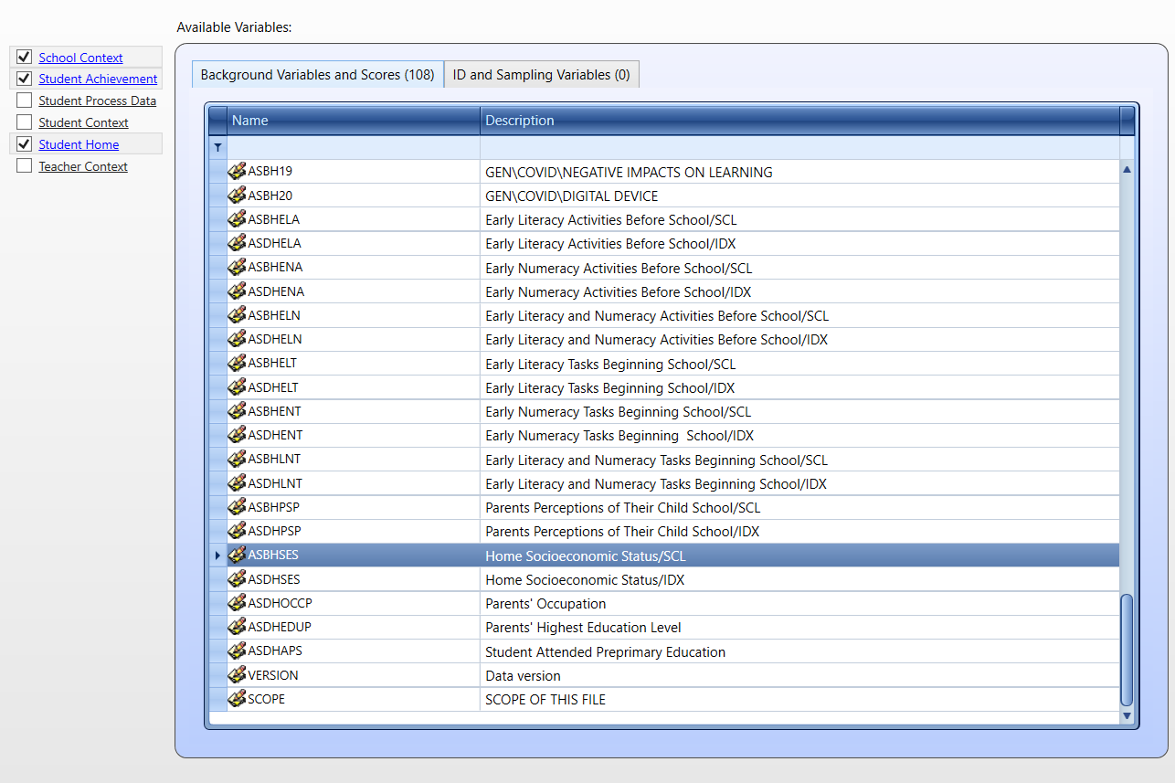 - ASBHSES - Home Socioeconomic Status/SCL (continuous variable); - ASDHSES - Home Socioeconomic Status/IDX (categorical variable);