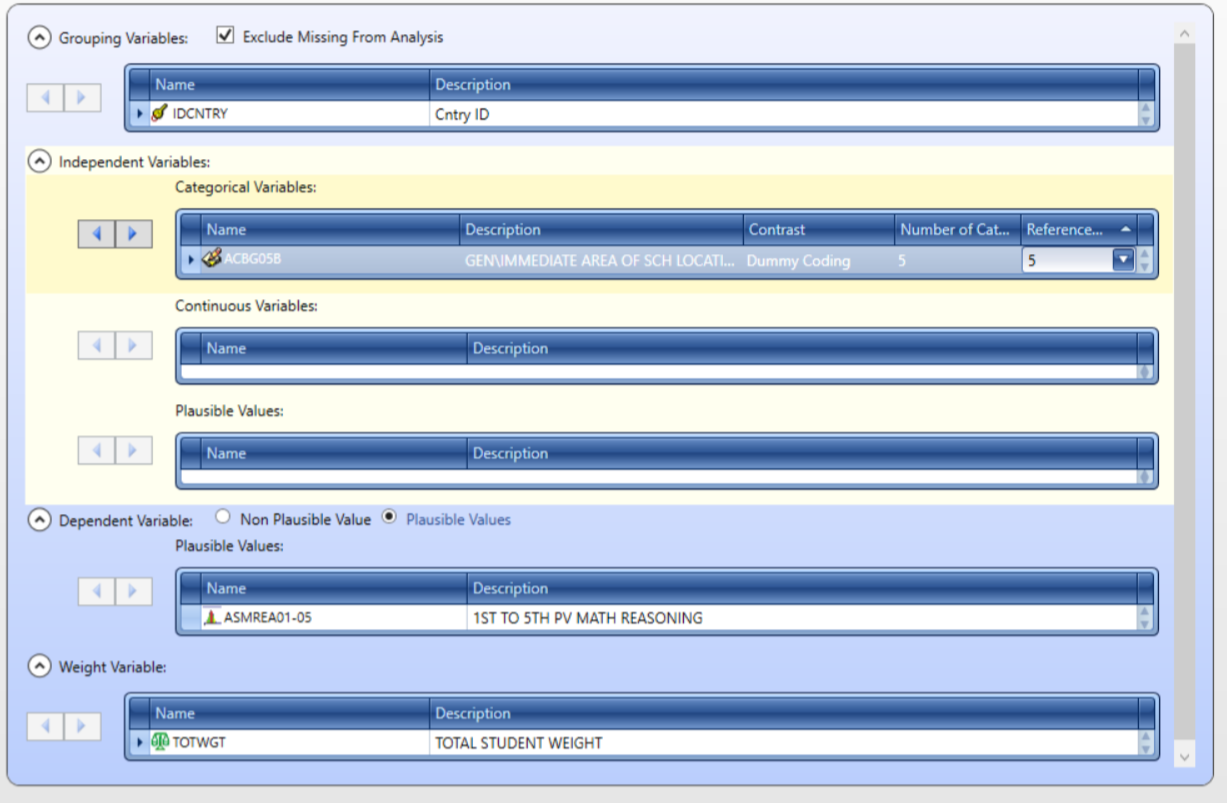 Now, we will go back to the analysis module of the IEA IDB Analyzer and select TIMSS (Using Student Weights) as the analysis type and Linear Regression as the Statistic Type.