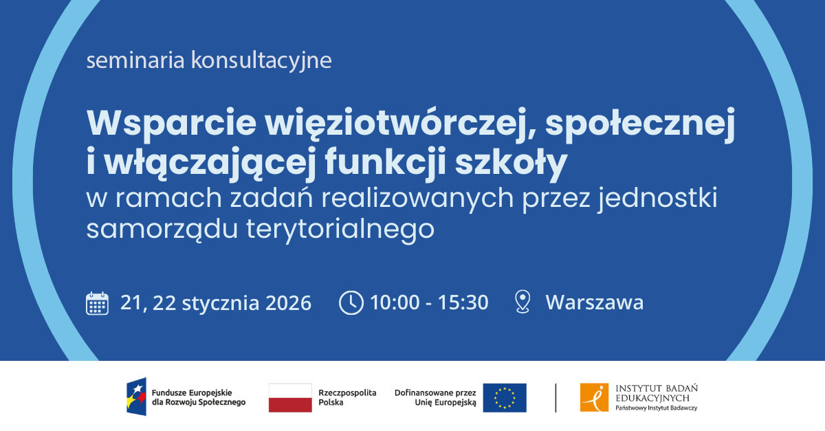Instytut Badań Edukacyjnych – Państwowy Instytut Badawczy serdecznie zaprasza przedstawicieli jednostek samorządu terytorialnego (JST) do udziału w seminariach konsultacyjnych.