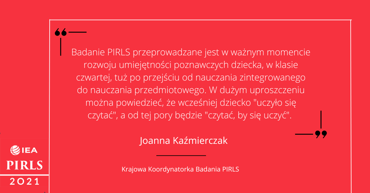 "Świetny wynik osiągnęli polscy czwartoklasiści w międzynarodowym badaniu umiejętności rozumienia czytanego tekstu. Polska, wraz z Finlandią, zajmuje 5. miejsce w świecie. Jest to najlepszy wynik wśród krajów Unii Europejskiej. To niewątpliwy sukces polskiej oświaty, nauczycieli, uczniów i rodziców” - wyjaśnia Joanna Kaźmierczak, Krajowa Koordynatorka Badania w Polsce.