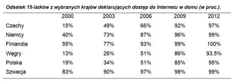 Oznacza to także wyrównanie dostępności Internetu. W 2003 r. wśród uczniów, których przynajmniej jeden rodzic miał wyższe wykształcenie, dostęp do Internetu miało 64,5 proc., podczas gdy wśród uczniów gorzej wykształconych rodziców odsetek ten wynosił niecałe 29 proc. W 2012 r. różnica była wciąż statystycznie istotna, ale wynosiła jedynie 5 pkt proc. (odpowiednio 94 i 99 proc.). Zmniejszyły się też różnice między miastem i wsią. W 2003 r. dostęp do Internetu deklarowało ok. 23 proc. uczniów szkół wiejskich i 47 proc. uczniów szkół zlokalizowanych w miastach powyżej 100 tys. mieszkańców. W 2012 r. różnica wynosi zaledwie 5 pkt. proc. (odpowiednio 93 i 98 proc.).