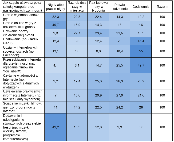 Polscy nastolatkowie nie różnią się w tym bardzo od rówieśników z innych krajów. Spośród tych, którzy codziennie korzystają z TIK w domu, najwięcej spędza ten czas w serwisach społecznościowych lub przeszukując Internet dla przyjemności, np. oglądając filmy na YouTube.