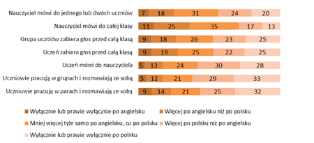 Na lekcjach języka angielskiego w szkole mówi się głównie po polsku – dotyczy to zarówno wypowiedzi uczniów, jak i nauczycieli (rys. 3). Uczniowie, których nauczyciele mówią wyłącznie po angielsku, czynią większy postęp i osiągają lepsze wyniki na koniec nauki w gimnazjum niż uczniowie, których lekcje prowadzone są w głównej mierze w języku ojczystym.